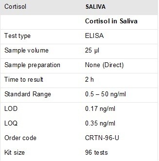 With our cortisol ELISA kit you can measure in less than two hours the cortisol levels in SALIVA samples. Only a small volume of saliva is needed for the analysis (please check the tables and the IFU for more detailed information).